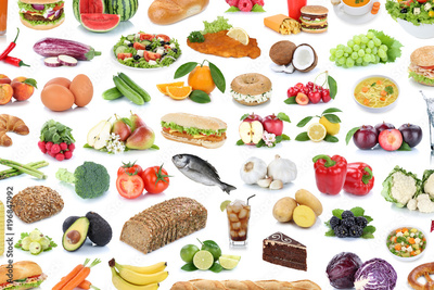 Essen Collage Hintergrund gesunde Ernährung Obst und Gemüse Früchte Food Freisteller
