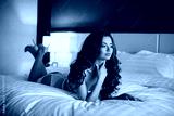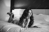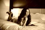 Beautiful, sexy and fashionable brunette model girl, in lingerie and stockings, posing on the bed - bride's morning