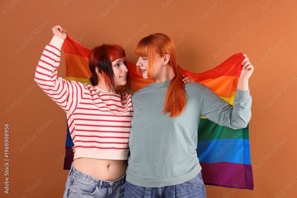 Lovely lesbian couple with rainbow flag on brown background. LGBT concept