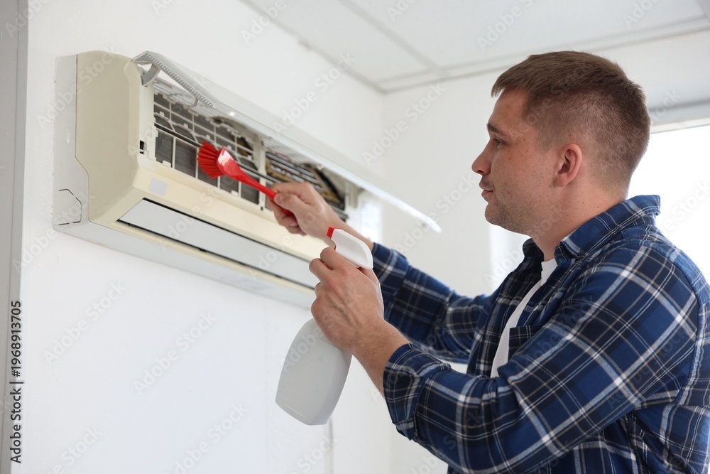 Man cleaning air conditioner with brush and spray indoors