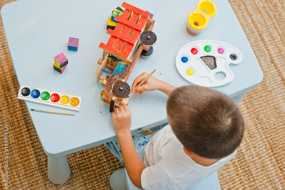 child paints a wooden typewriter