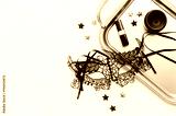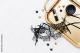 Flat Lay with Black venetian mask, gold tray, lipstick on white background. Sexy Female Accessories