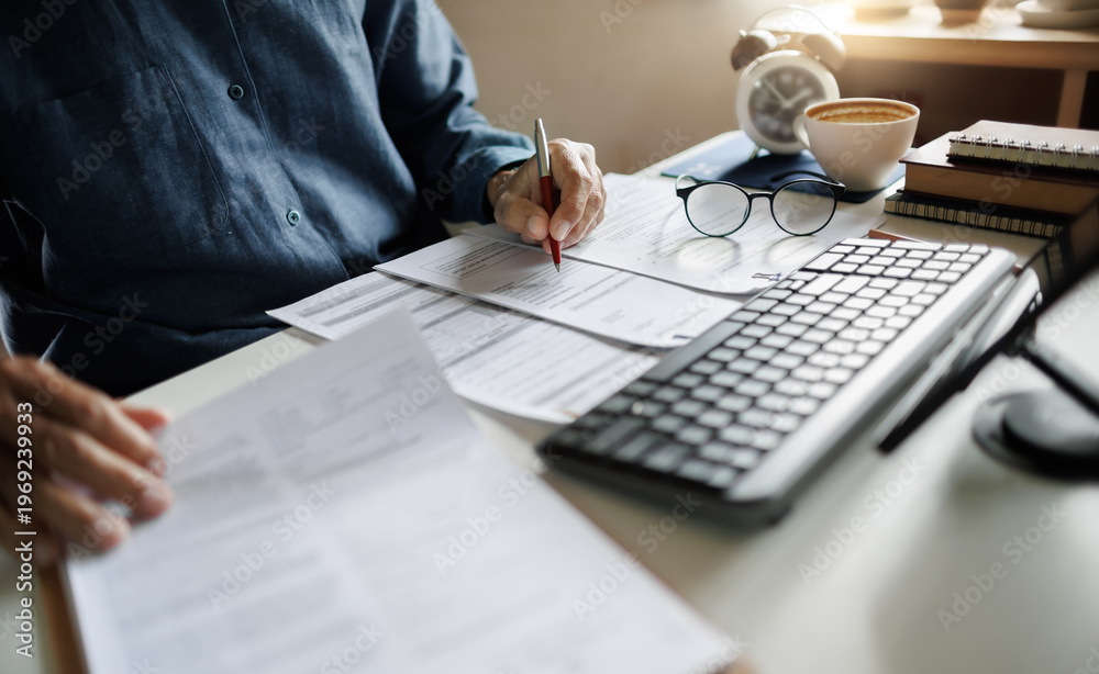 close up shot, asian businessman working on desk reading document contract. legal expert, professional lawyer reading and checking financial document business contract