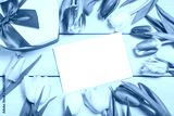 Colorful spring tulip flowers with decorative giftbox and blank photo on light blue wooden background as greeting card. Mothersday or spring concept.