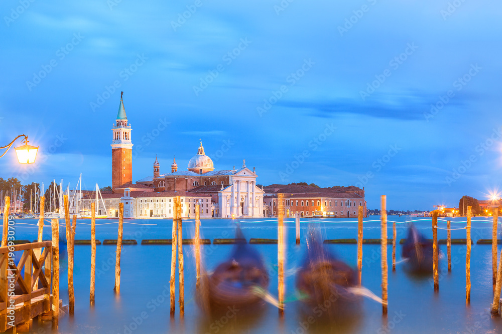 San Giorgio Maggiore church and gondolas in Venice, Italy during blue hour sunrise. Focus on the church.
