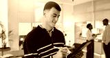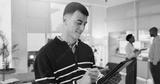 Man, stylus and tablet for media agency, smile and approval for online news report. Person, copywriting and journalist in workplace, success and email for magazine column, company blog and happiness