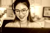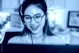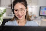 Beautiful asian woman with glasses wearing headset working in bright office environment providing friendly customer service and smiling with cheerful happy expression looking at monitor