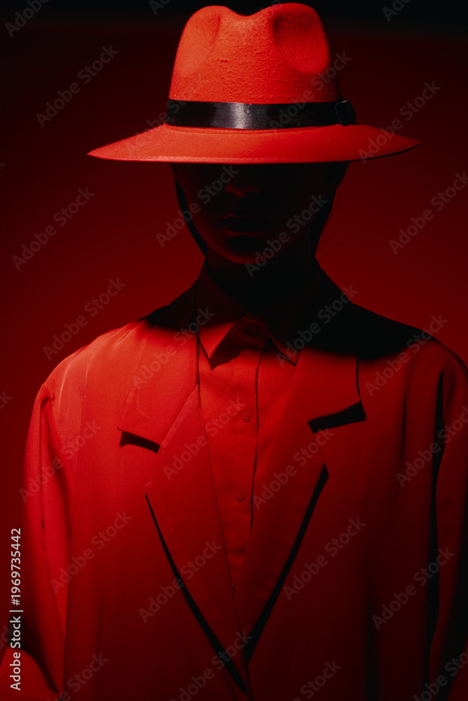 Female model dressed in vibrant red fashion coat and hat posing under dramatic studio lighting. Concept of modern beauty creative, mysterious style, and striking fashion photography.