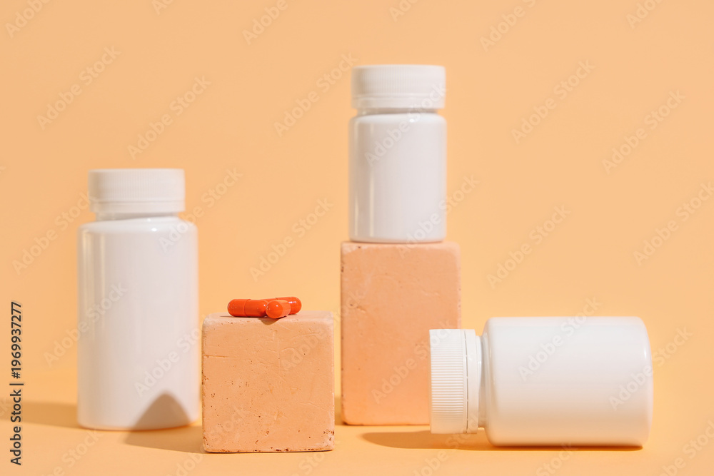 Decorative podiums with blank plastic vitamin bottles and pills on orange background