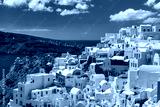 Picturesque view of white houses and church with blue domes in Oia or Ia, island Santorini, Greece