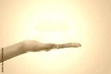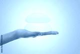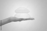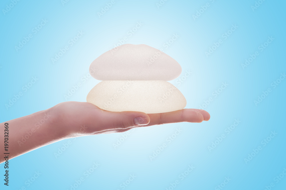 Silicone breast implant on hands .