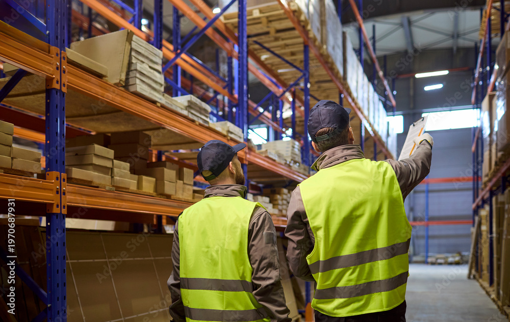 Warehouse workers perform inventory stocktaking with clipboard. They coordinate storage, check boxes and plan shipping in a modern facility. Reliable teamwork and stock control concept.