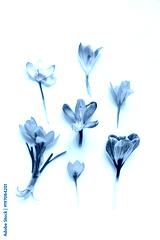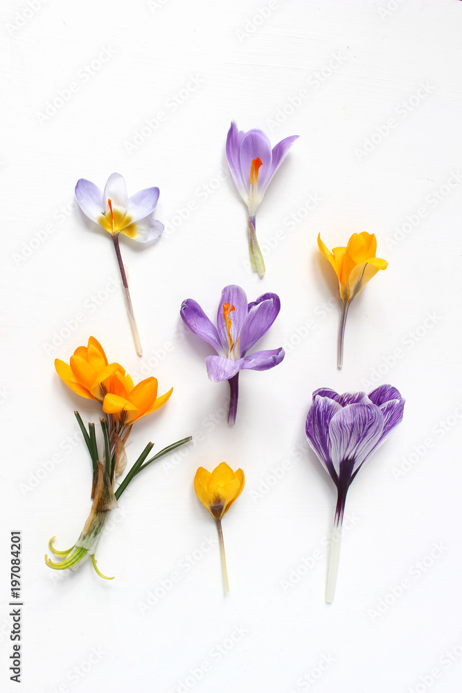 Spring, Easter floral composition. Yellow and violet crocuses flowers on white wooden background. Styled stock photo. Flat lay, top view.