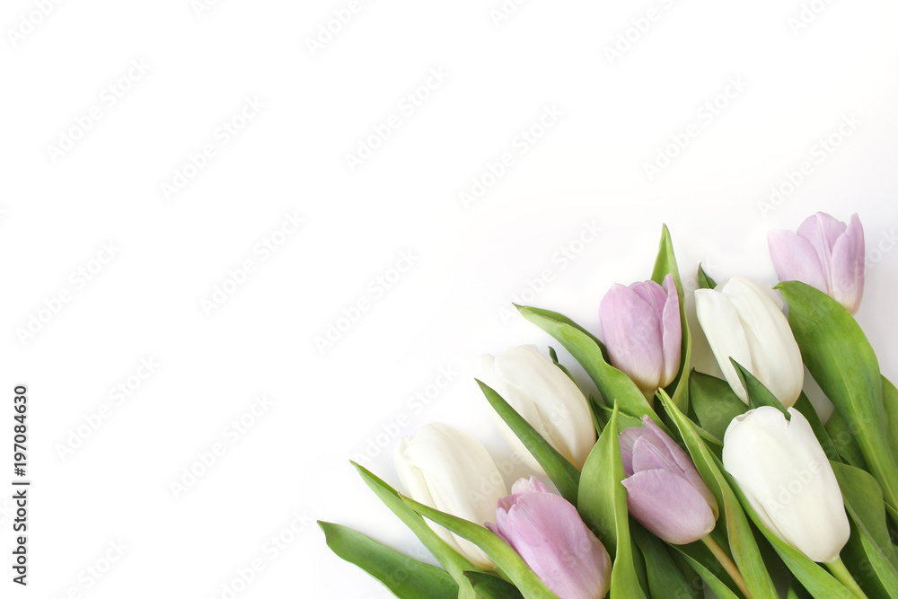 Spring styled stock photo. Easter concept. Feminine desktop scene with bouquet of white and violet tulip flowers on white table background. Empty space. Flat lay, top view.