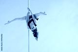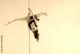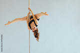 Beautiful pole dancer performing in the studio. Seria photo of middle aged red hair woman in black bra and shorts workout pole dance on air with different poses.