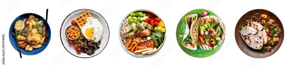 PNG Colorful, diverse, delicious, plated, meals on transparent background