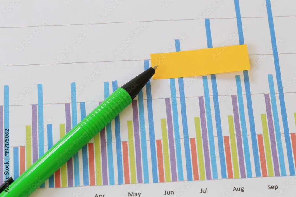 Green pen pointing to the data of business graph background and have yellow note paper.