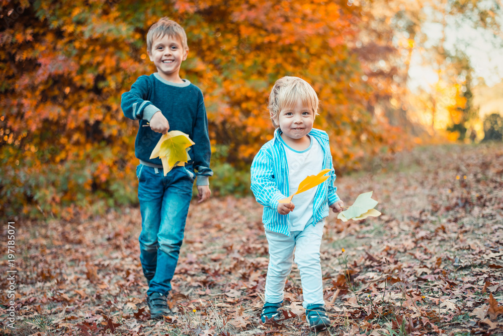 Two smiling kids in autumn park