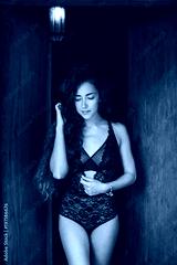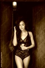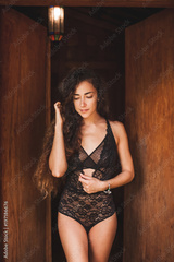 Young thin brunette woman with long black hair posing in lace black body lingerie