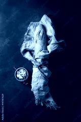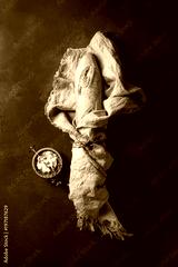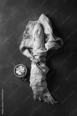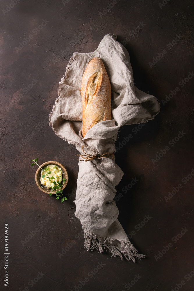 Loaf of fresh baked artisan baguette bread in linen cloth with butter and herbsover dark brown texture background. Top view, copy space.