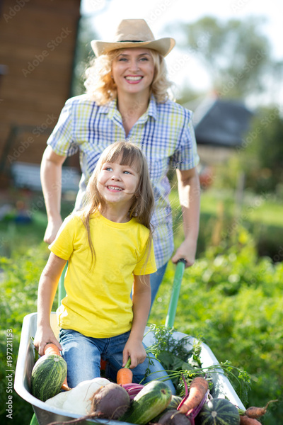 Kid girl and her mother in domestic garden. Happy child and mom push the wheelbarrow with harvest. Healthy organic vegetables for children