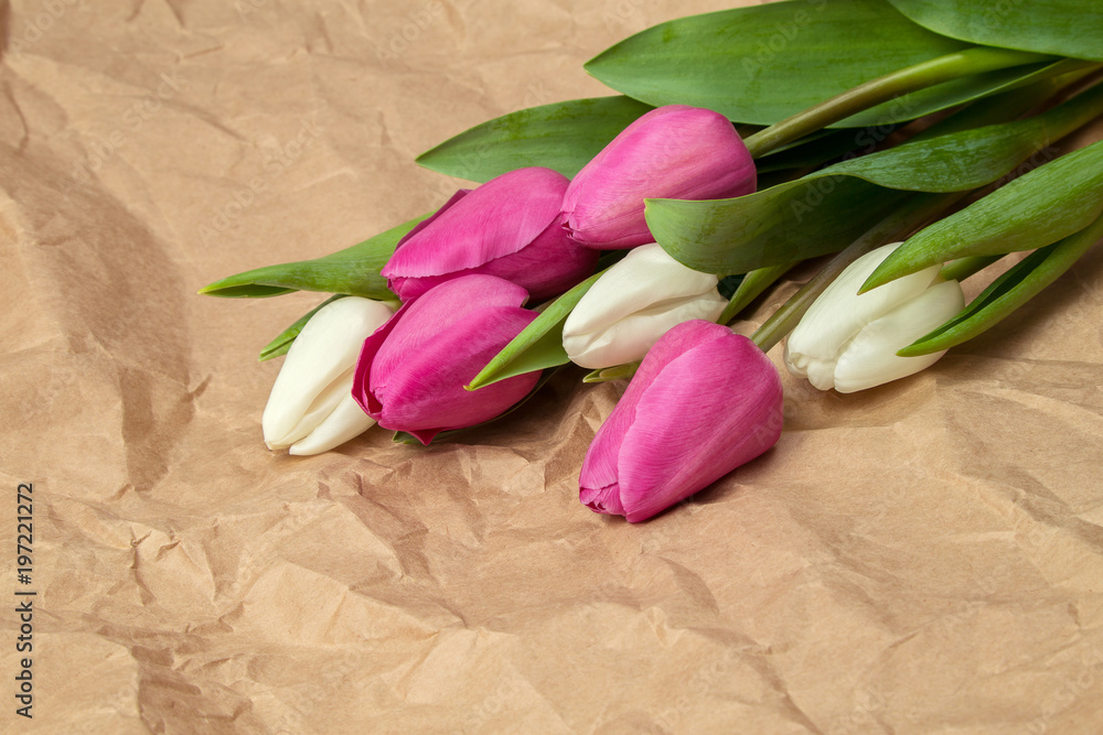 spring bouquet of pink and white tulips on kraft paper