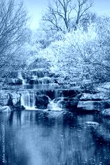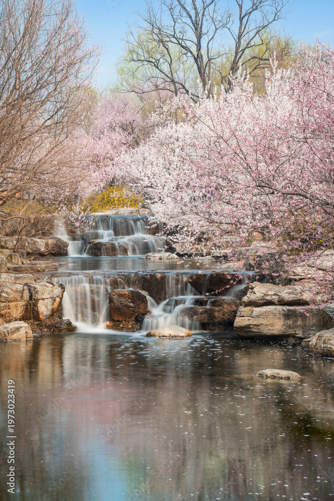 Serene Spring Landscape Featuring a Gentle Waterfall and Cherry Blossoms Reflecting on a Calm Pond Surface