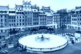 Old Town Market Place with Statue of Syrenka, Mermaid of Warsaw, in the center of the ice rink and colorful houses during morning blue hour, Warsaw, Poland.