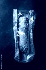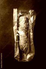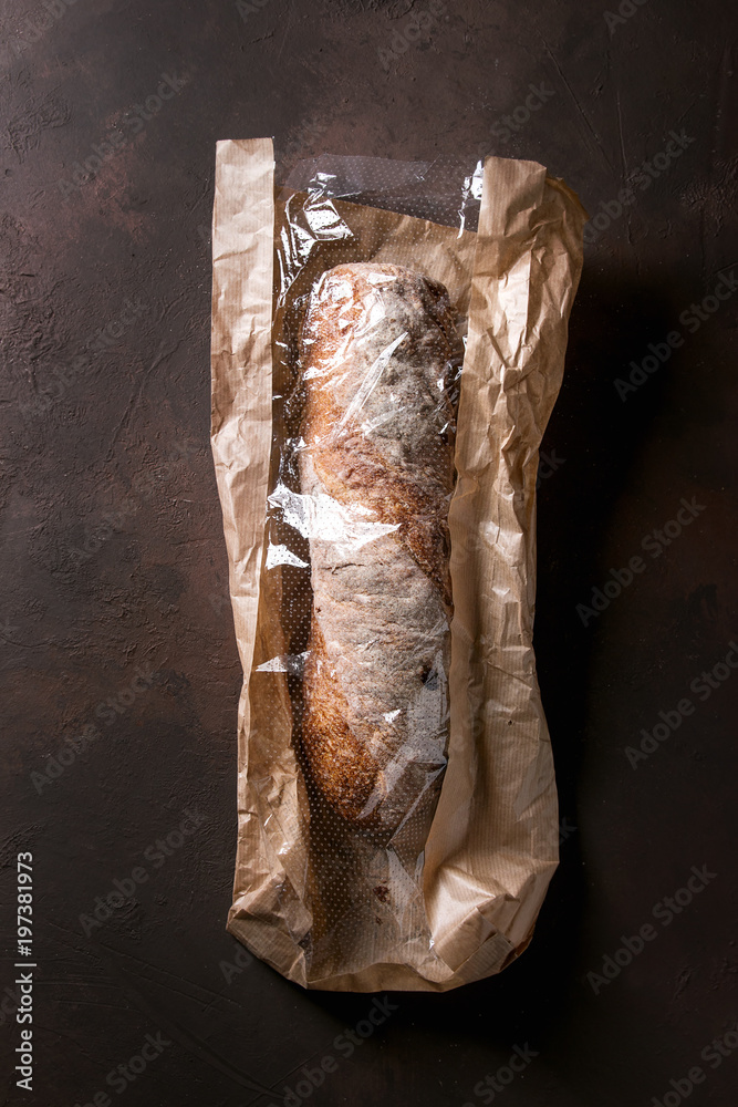 Loaf of fresh baked artisan whole grain ciabatta bread in market paper bag over dark brown texture background. Top view, copy space.