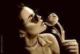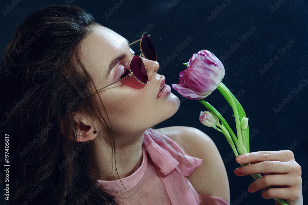 Close up studio portrait of young beautiful sexy model woman wearing trendy violet sunglasses, holding tulip, posing on dark background. Fashion, beauty concept