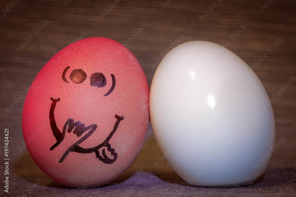 Eggs faces, drawnigs on eggs. Two eggs in love, being together, one without eggshell - nude.