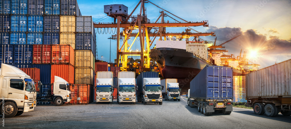 Business Logistics and transportation concept of Container Cargo ship and Cargo plane with working crane bridge in shipyard at sunrise, logistic import export and transport industry background