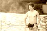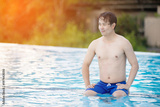 Young man in pool with smile face.