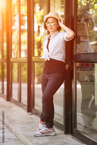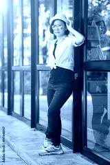 Women wearing hat standing in front of a glass building