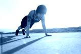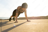 Woman exercising plank pose outdoors at sunset