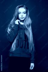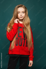 Stylish teen, beautiful young model girl with long blonde hair, posing at studio in jeans and red sweatshirt