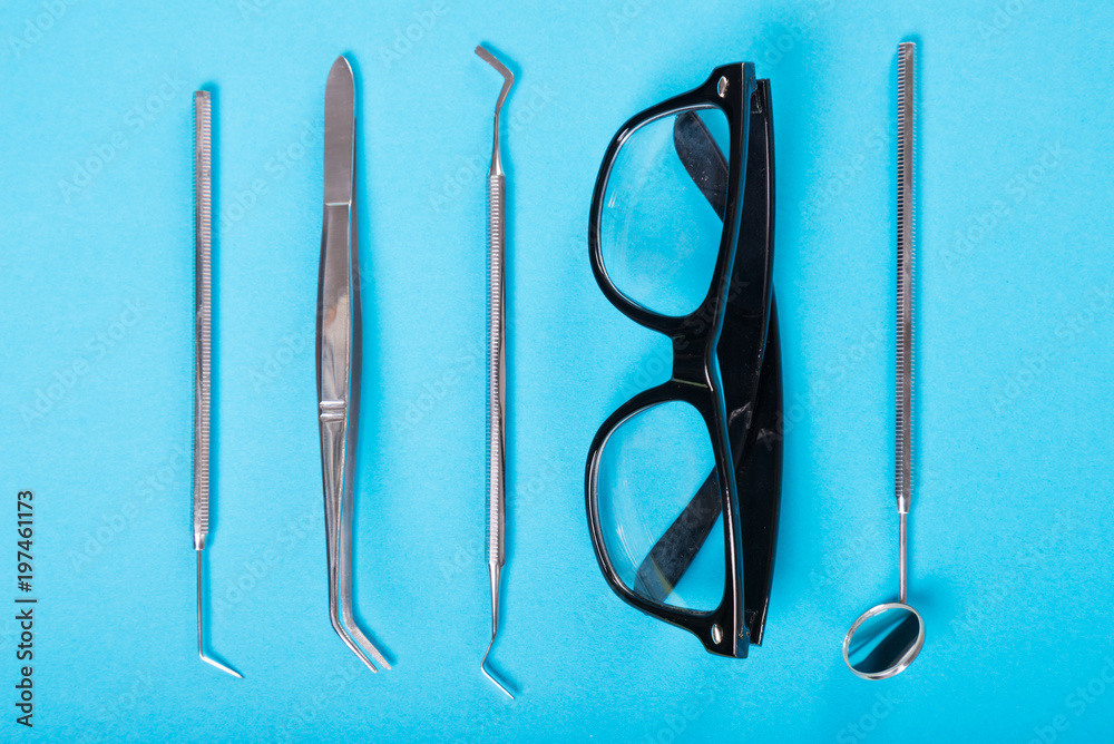 Dentistry set of tools and glasses on blue background.