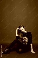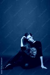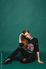 Fashionable and beautiful young model girl with blonde hair, in black dress and boots isolated at dark-green background