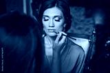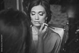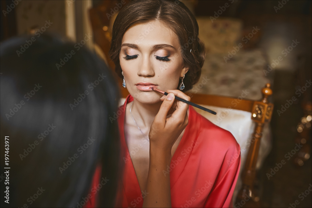 Makeup artist applies makeup for beautiful brunette young woman with sexy lips and closed eyes, wearing in peach peignoir
