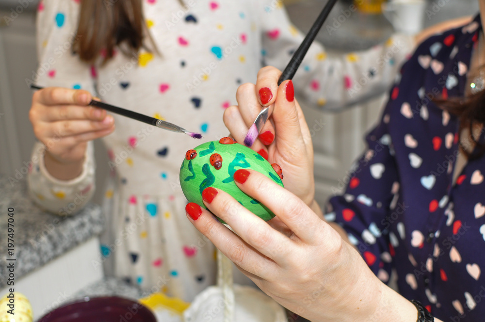 Mother and daughter painting Easter eggs. Mom and girl with bunny ears painting and prepare eggs for Easter together