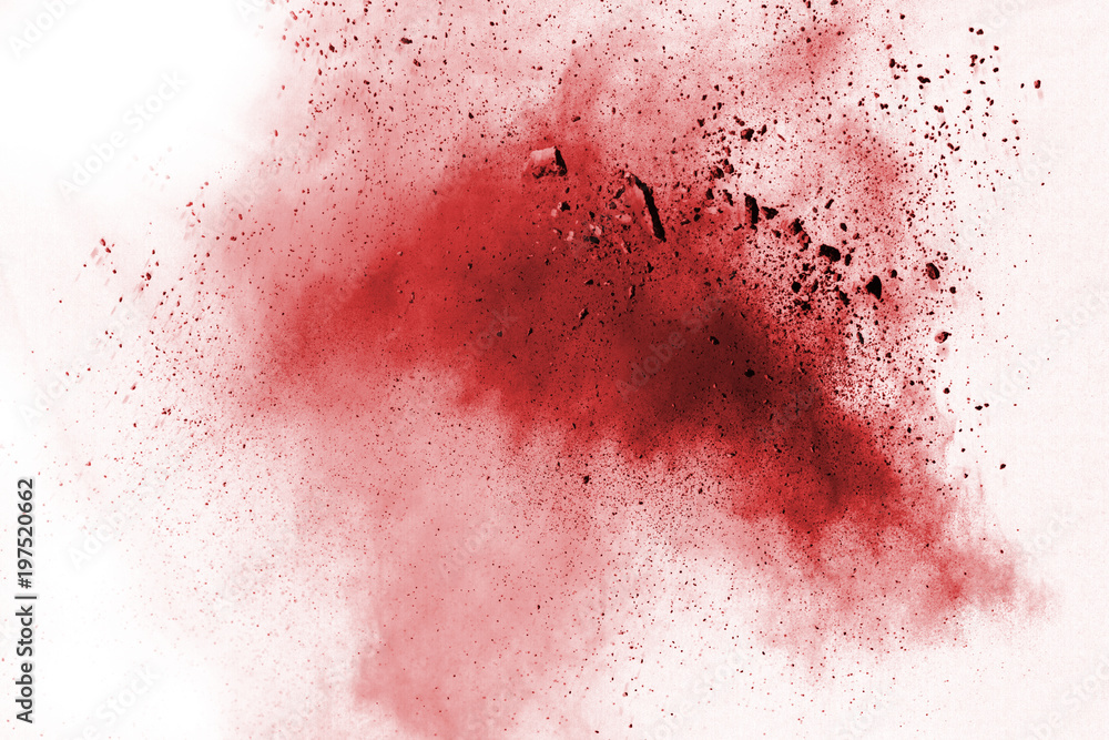 Red powder explosion on white background. Colored cloud. Colorful dust explode. Paint Holi.