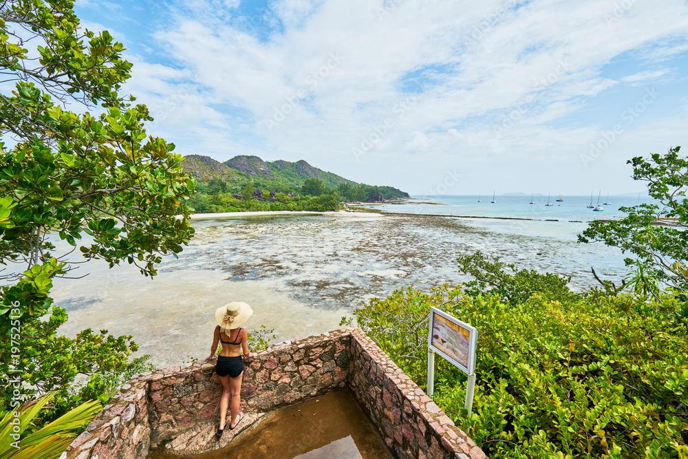 Woman tourist explores Curieuse island coastal trail to Anse St.