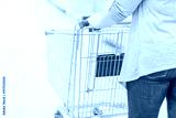 Closeup of woman hand and back with shopping cart in supermarket. Shopping concept. Selective focus with focus on hand