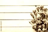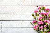 Pink flowers, spring bouquet on table, flat lay, top view on white wooden background with copy space