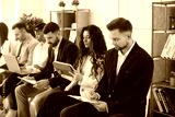 Employees, corporate staff members, applicants sitting in row in office working on diverse devices, writing notes, ideas in clipboard, preparing for job interview or upcoming meeting with clients
