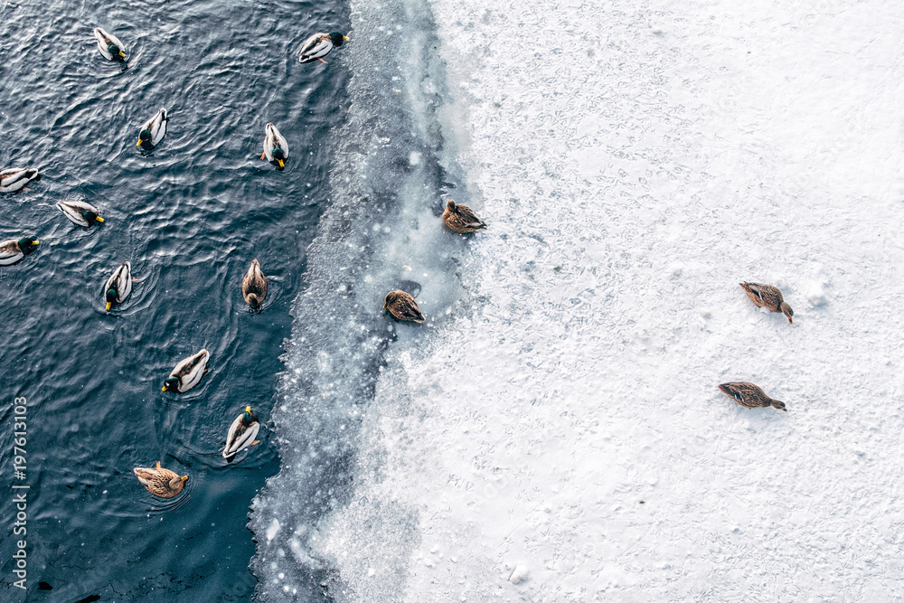 Ducks swimming on winter pond