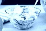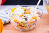 Tropical fruit salad with yoghurt in a glass cup on a wooden table - fruit diet