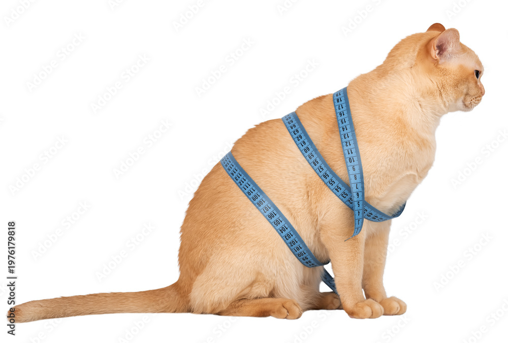 Burmese cat with measuring tape isolated on white background pet diet concept