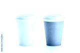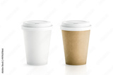 Blank white and brown disposable paper cups with plastic lid mock up isolated, 3d rendering. Empty polystyrene coffee drinking mug mockup front view. Clear plain tea take away package, cofe branding.