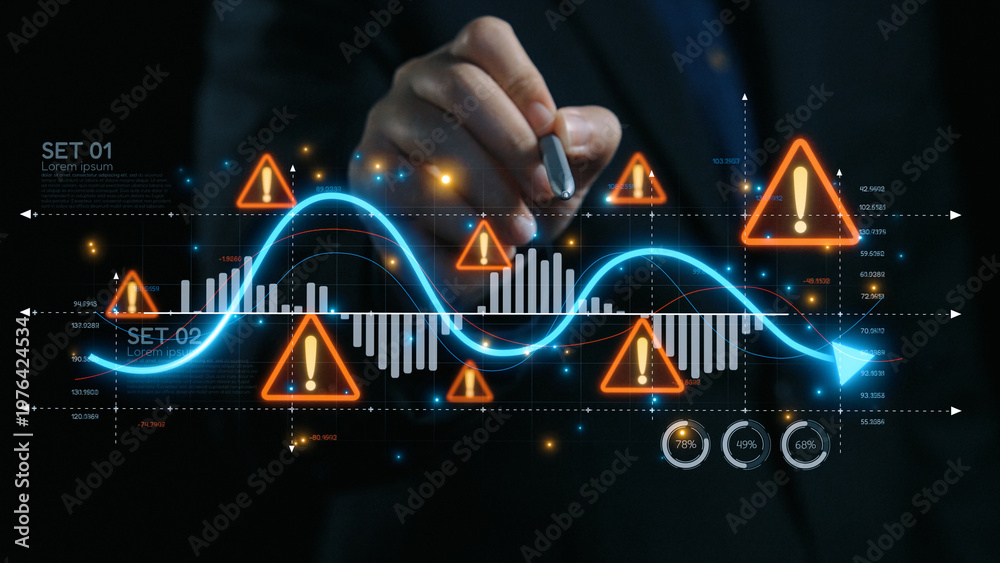 Economic caution visual showing risk alerts and financial volatility. Warning signs highlight economic downturn, market risk, finance crisis, and uncertainty in data-driven analysis. Elide
